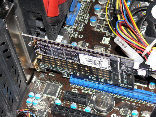 Получается как-то вверх ногами (либо наклейку так лепят), но ничего страшного. Вставляем всю конструкцию в слот PCI-E x4 (а поскольку на моей материнской плате такого нет, то вместо видеокарты) и подключаем кабель SATA:
