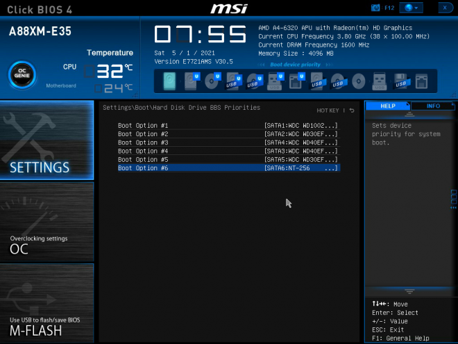 Как ни странно, все заработало. Если честно, я слегка побаивался подобной китайщины. Благодаря интерфейсу SATA накопитель естественно может быть выбран в качестве загрузочного. Время в биосе по Гринвичу (UTC) из-за специфики линуксов.