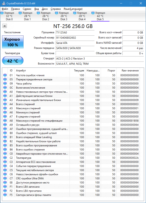 Начальные показания S.M.A.R.T. в программе CrystalDiskInfo 8.12.0: