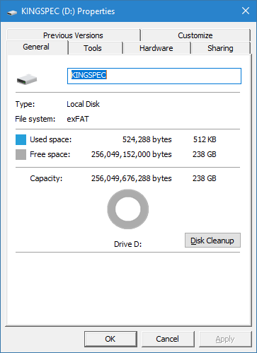Я решил идти в ногу со временем и инициализировал диск в GPT, а для проведения тестов отформатировал в exFAT. В таком варианте объем тома составил 238 ГиБ (256049676288 байт).