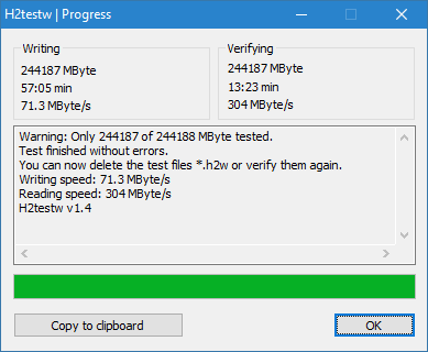 Я не мог не проверить NT-256 на соответствие заявленному объему с помощью h2testw. Заодно можно оценить, когда начинается падение скорости.