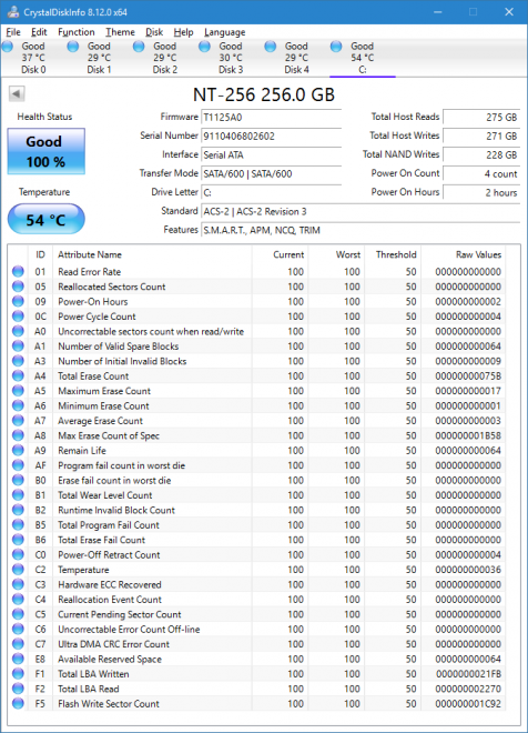 Как видим, температура установилась на отметке 54°C, что вроде бы довольно неплохо. Конечно опять же смотря что именно там измеряется, но и на ощупь накопитель был теплым (а не горячим). Еще одна любопытная деталь это различие Total Host Writes и Total NAND Writes. Возникает вопрос, куда записались 43 гига?