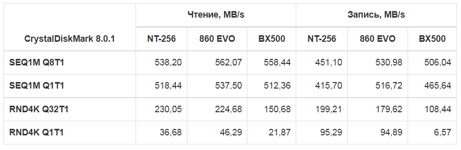 Я специально перемерил производительность BX500 в CrystalDiskMark 8.0.1 для этого сравнения (поскольку изначально использовал 7-ю версию), и что-то с произвольными субтестами дела совсем у этого накопителя стали плохи, хотя вроде и TRIM делал, и довольно много времени прождал в надежде на сбор мусора (выходит не дождался). Впрочем и в 7-й версии теста показатели RND4K Q1T1 были небольшими (16,89/46,87). Что интересно, большинство все тех же произвольных показателей NT-256 даже превосходят 860 EVO, кроме полностью произвольного чтения. Таким образом, в CDM производительность Kingspec оказалась ближе к топовому 860 EVO, нежели бюджетному BX500. По крайней мере пока накопитель новый.