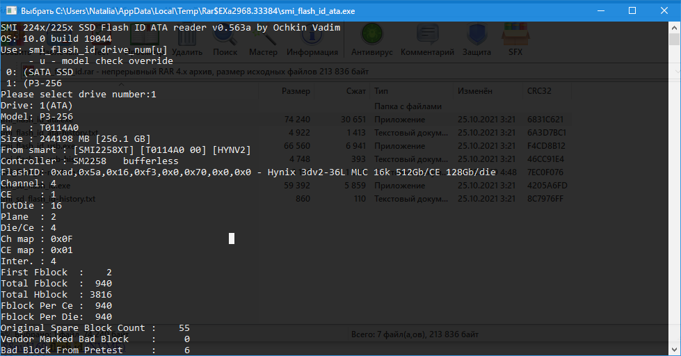 Микросхемы памяти промаркированы кодом H27Q2T8CQC3R. Для определения внутренней начинки SSD воспользуемся программой Вадима Очкина Flash ID.