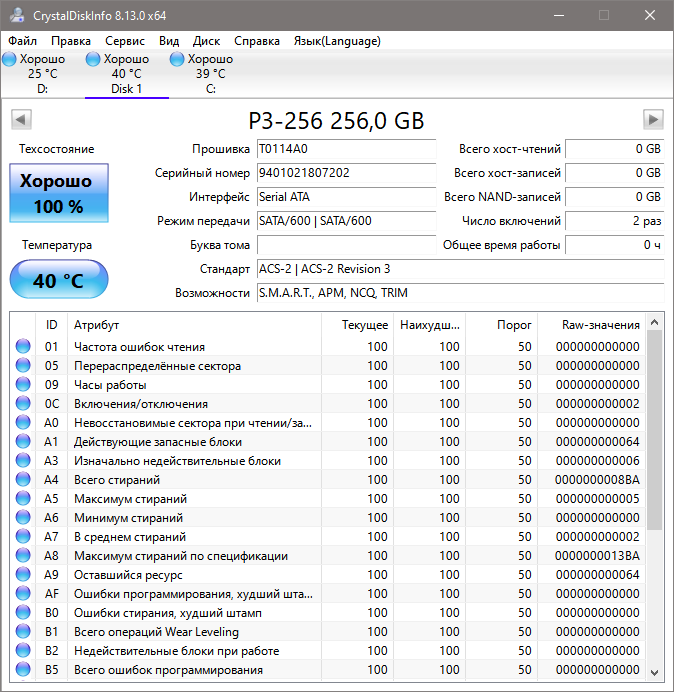 Посмотрим, какую информацию об SSD KingSpec P3 256 выдаст Crystal Disk Info (8.13.0 x64).