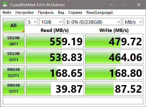 Для начала прогоним накопитель в Crystal Disk Mark 8.0.4 x64. Объём данных 1000 MB, 5 прогонов, режимы тестирования по умолчанию.