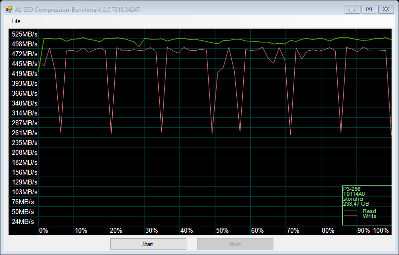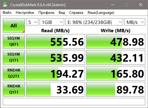 Ожидаемые показатели для SATA-накопителя, работающего на контроллере SM2258XT. К слову, они практически идентичны скорости SSD Tesla, в основе которого лежит тот же самый контроллер. Посмотрим, как изменится скорость, если заполнить диск данными.