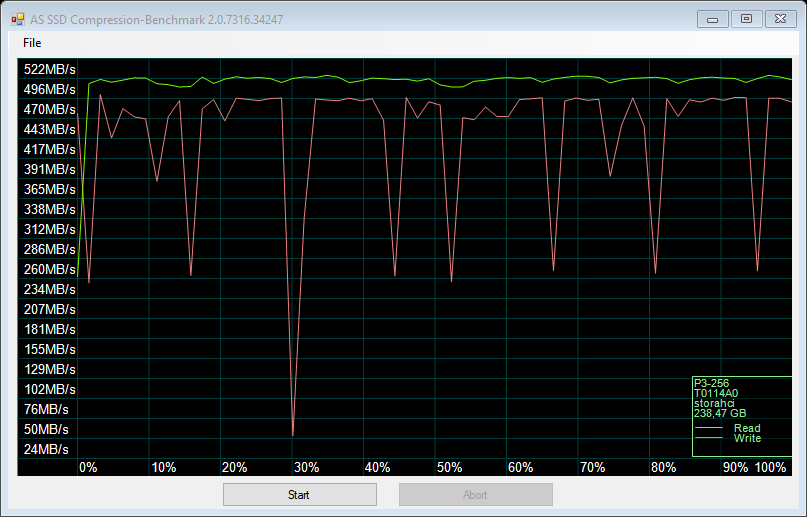В целом критического падения производительности нет, скорость чтения вообще осталась неизменной. На графике записи присутствуют с десяток кратковременных отрицательных пиков (один раз даже до 50 MB/s), но на скорости выполнения реальных задач они практически не отразятся.